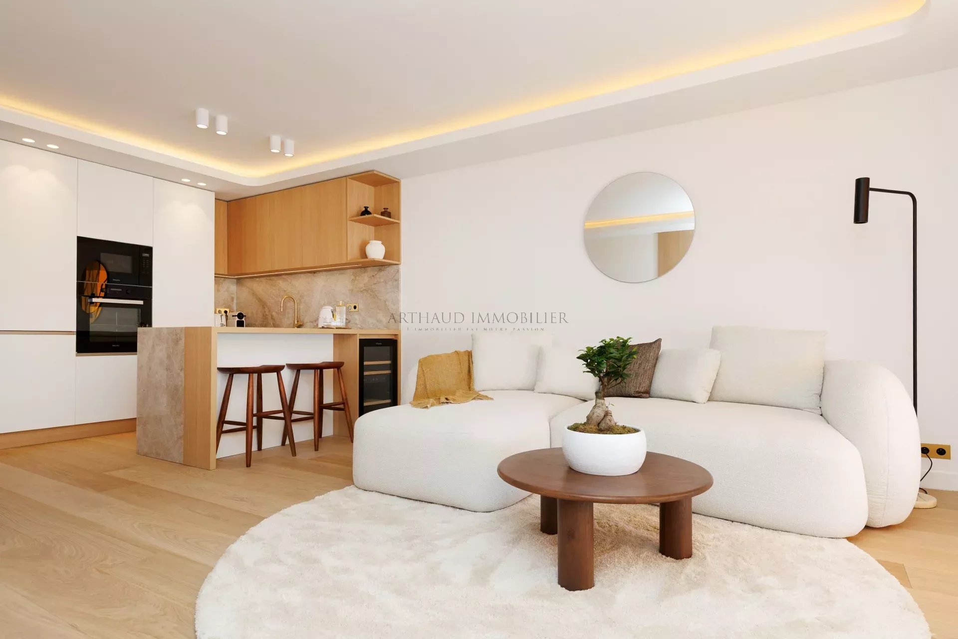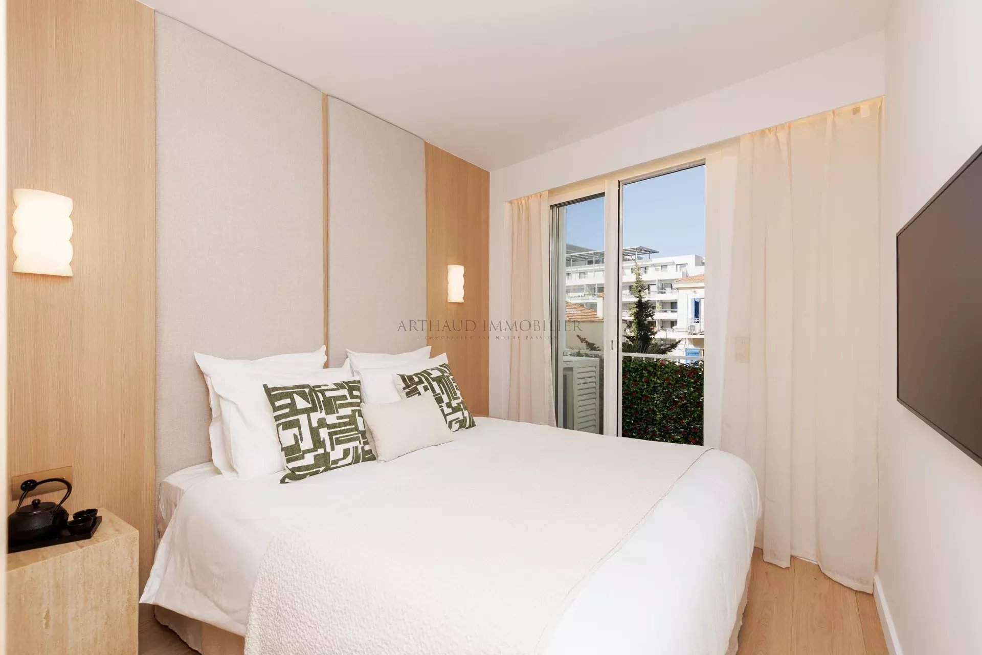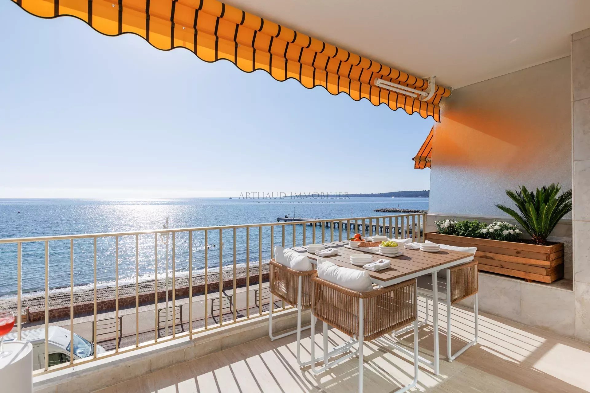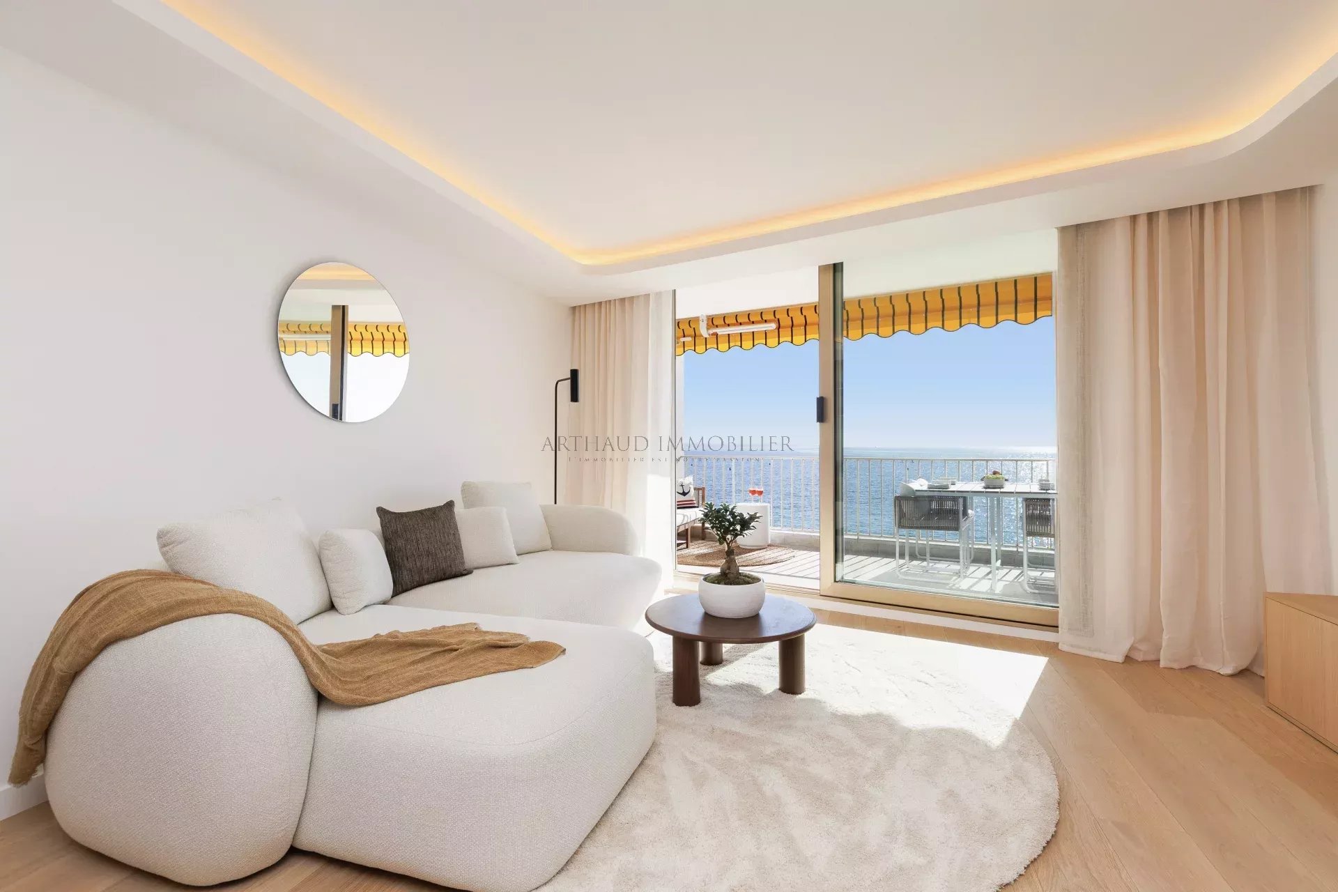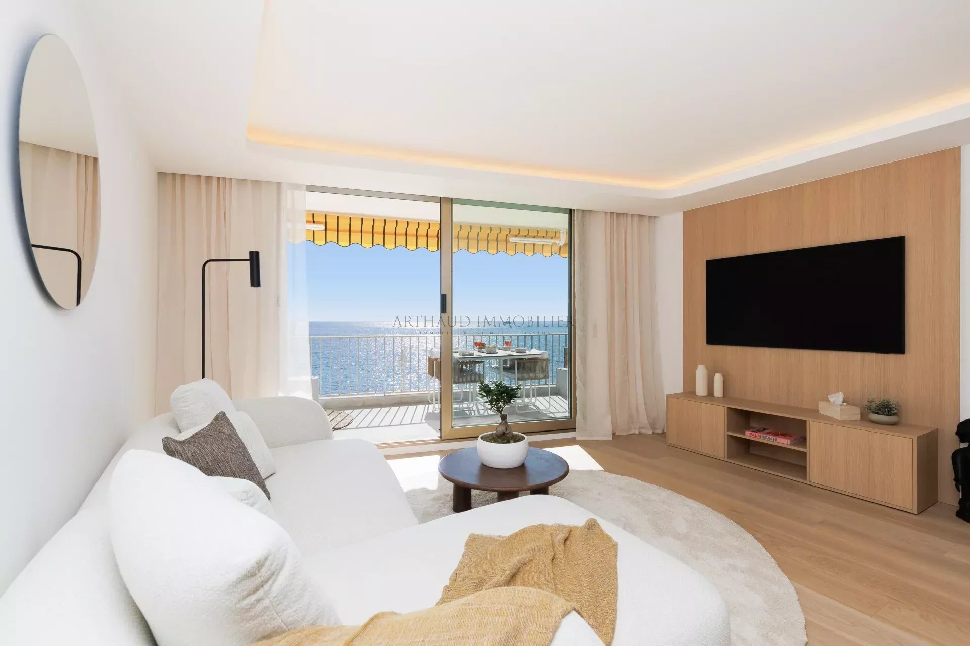 Séjour prolongé par une terrasse panoramique de 10 m² face aux Îles de Lérins.